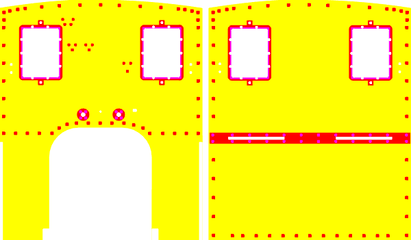 To etch the sheet metal we need two films. The sheet will be etched to half of its thickness from each side. Here comes the key: We use red for areas which should be present on both films and yellow and magenta for respective over and under film. That is, we use red wherever full plate thickness is needed, yellow and magenta means half plate thickness from respective side - simple!